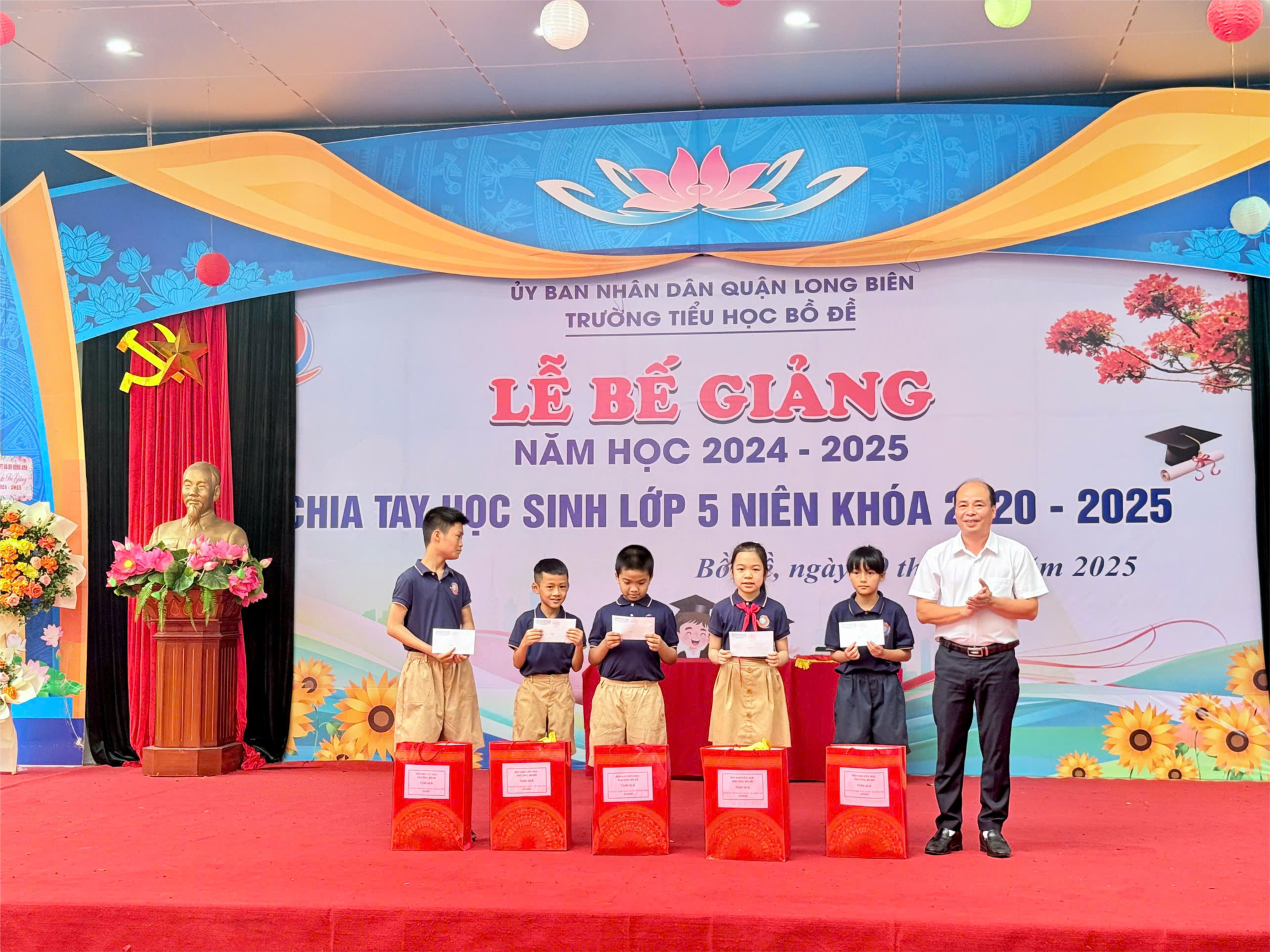 Sáng ngày 29 tháng 5 năm 2025, tại sân trường Tiểu học Bồ Đề – quận Long Biên, Hà Nội đã diễn ra Lễ bế giảng năm học 2024 – 2025, chia tay học sinh lớp 5 niên khóa 2020-2025 trong không khí trang trọng, ấm áp và đầy cảm xúc. Buổi lễ bắt đầu từ 7 giờ 30 phút với sự tham dự của đông đảo đại biểu, phụ huynh và học sinh nhà trường.