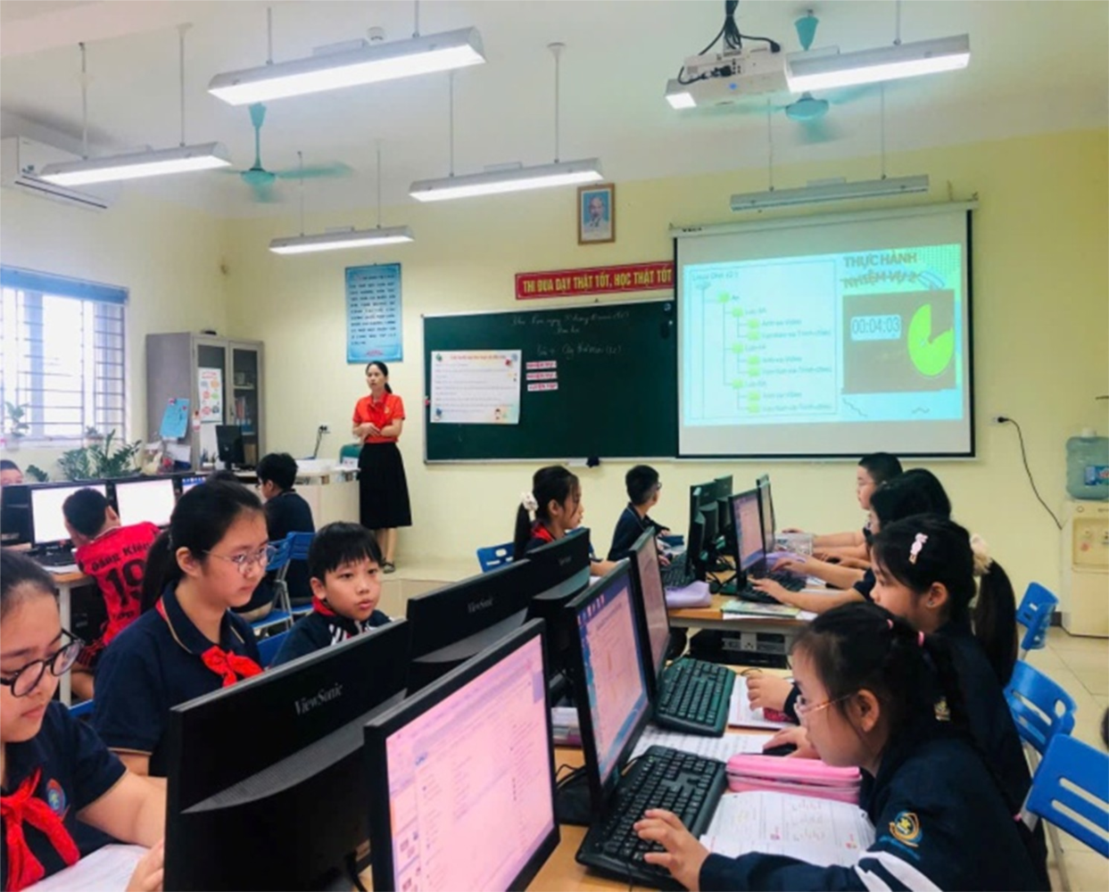 Trong quá trình giảng dạy, cô giáo linh hoạt vận dụng các phương pháp dạy học tích cực như hoạt động nhóm, trò chơi học tập, hỏi - đáp nhanh và thực hành trên máy tính. Đặc biệt, việc ứng dụng công nghệ thông tin và AI, kết hợp hình ảnh trực quan giúp học sinh dễ tiếp cận, ghi nhớ kiến thức và tăng hứng thú học tập. Học sinh thể hiện sự tự tin, chủ động, hợp tác tích cực và biết vận dụng kiến thức để hoàn thành nhiệm vụ học tập thông qua hoạt động thực hành, luyện tập.